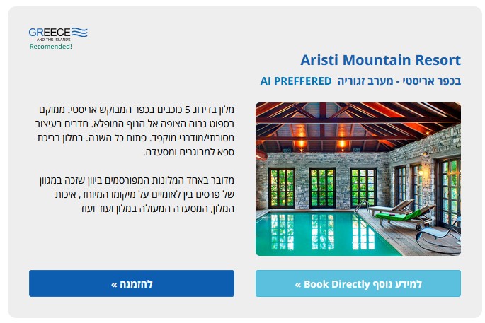 As Israel's leading travel platform for Greece, we connect your hotel directly with thousands of Israeli travelers. Through premium placement on our site and our smart AI-driven search, we ensure your property stands out